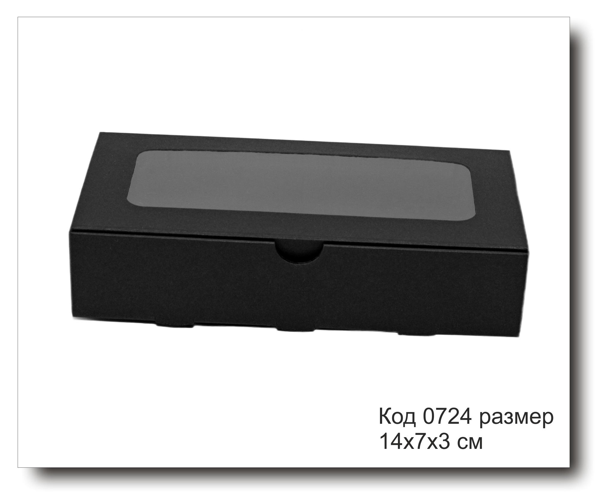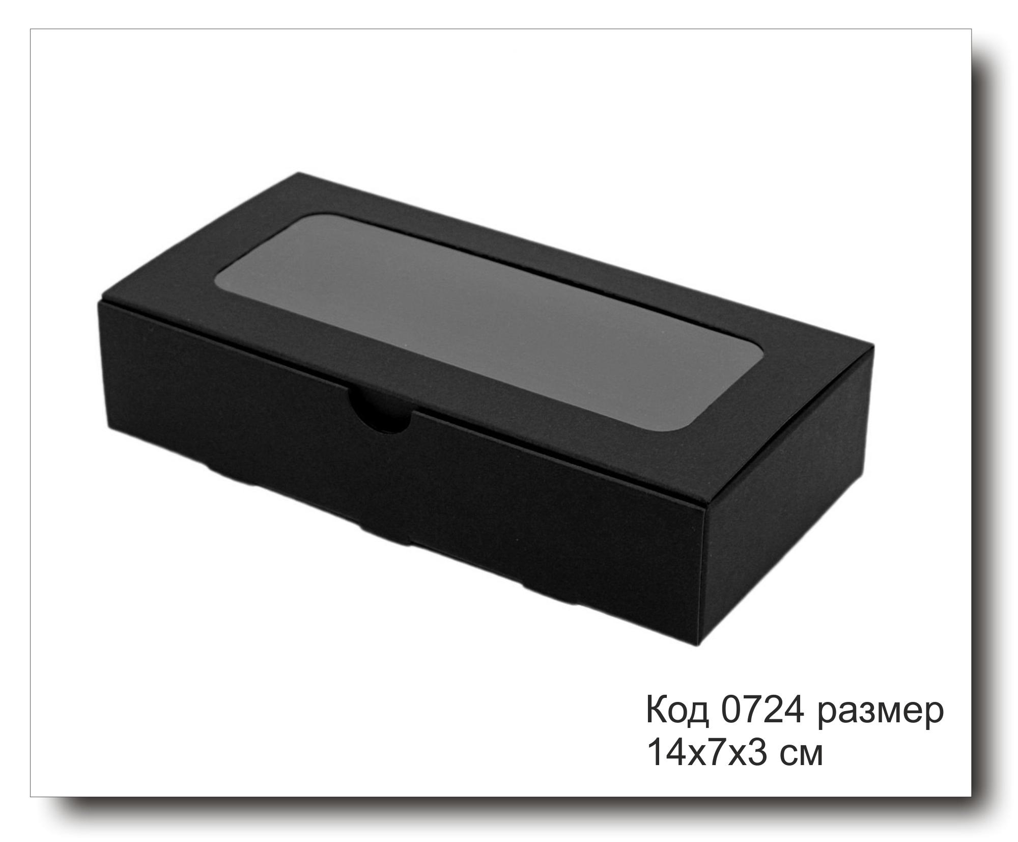 Коробка размер 14х7х3 см с прозрачным окном - идеальное решение для упаковки различных маленьких подарков. Изготовлена из черного крафт картона, окошко коробки заклеено прозрачной пленкой, что позволяет видеть содержимое. Коробка поставляется в разобранном виде, собирается легко без использования клея.